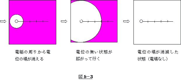 この後、電気を切ると、電極から電圧が消え、電位の無い状態がA→B→C→Dの順で拡がって